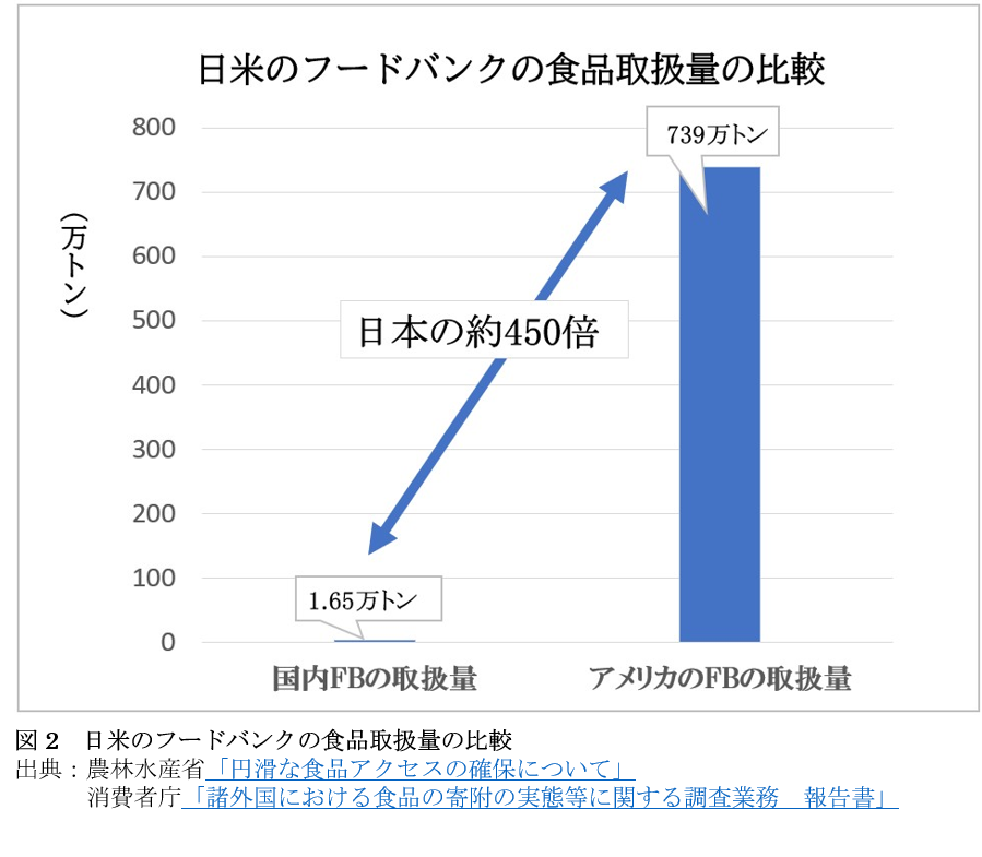 それに対し、アメリカのフードバンクの年間食品取扱量は739万トンにのぼり、これは国内の食品ロス発生量(464万トン)より多く、日本国内フードバンクの取扱量である1.65万トンの約450倍に相当します(図2)。このようにアメリカでは、膨大な量の食品ロス削減と、経済的な困難を抱える世帯への食料供給に、フードバンクが大きく貢献しています。