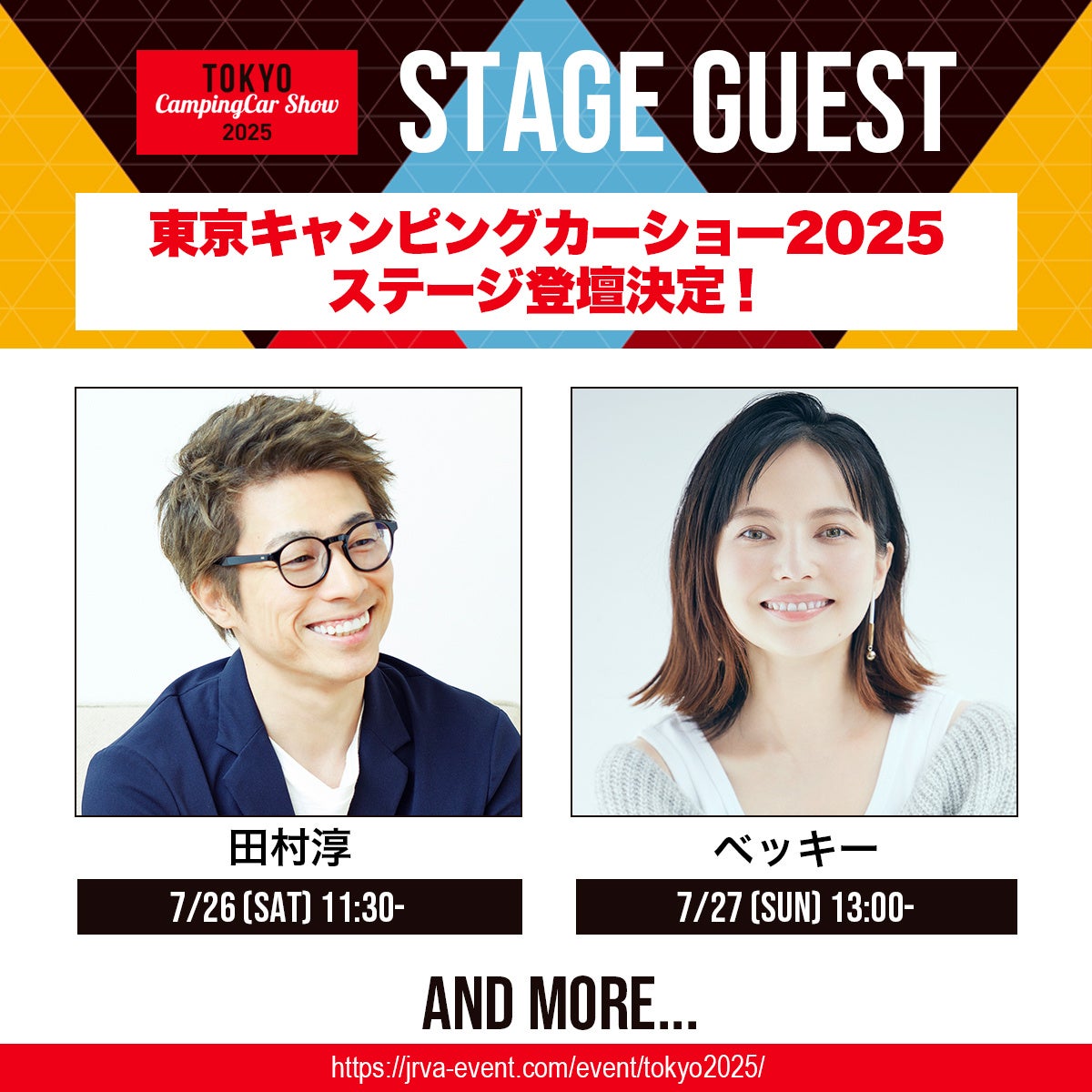 毎年豪華なゲストが集結する東京キャンピングカーショー2025のステージに、芸能界きってのキャンピングカー愛好家である田村淳さんと、実際にキャンピングカーでの旅を体験したベッキーさんの登壇が決定しました。