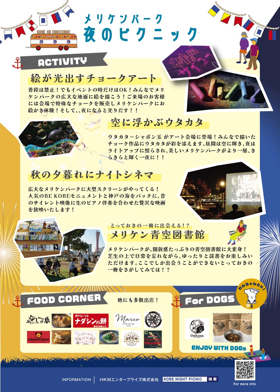 2022年よりHKMエンタープライズ株式会社、神戸港“U”パークマネジメント共同事業体、メリケンパーク協議会が主催となり、メリケンパークにおいて地元ならではの地産地消の食や体験型アートを通じ、神戸資源の再発見・再発信を目的とし、神戸の魅力をお届けしてきた秋の風物詩となる今年で4回目の開催となるイベント。山と海に囲まれ、ポートタワーや海洋博物館などの神戸を代表するランドマークが集まるメリケンパークで、地元ならではの飲食店や団体など日ごとに約30店舗に出店していただき、神戸の食をピクニック気分でお楽しみいただきながら、光るチョークアートや青空図書館、屋外シネマ、ステージイベントなどを通じて神戸の魅力に触れていただける機会の創出に取り組んでいる。