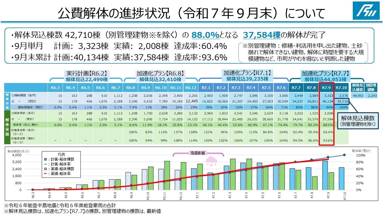 令和6年能登半島地震及び奥能登豪雨における公費解体の進捗状況については、9月末時点で、解体見込棟数42,710棟(別管理建物※を除く)の88.0%に相当する約3万8千棟の解体が完了しています。