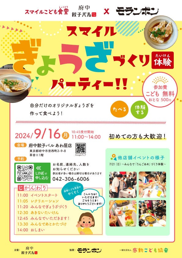 一般社団法人 感動こども協会(所在地:東京都新宿区、以下、当協会)の正会員である感動こども食堂「府中餃子バル あわ屋店」にて、2024年9月16日(月曜日)にイベント『スマイルぎょうざづくり体験パーティー 』を開催します。