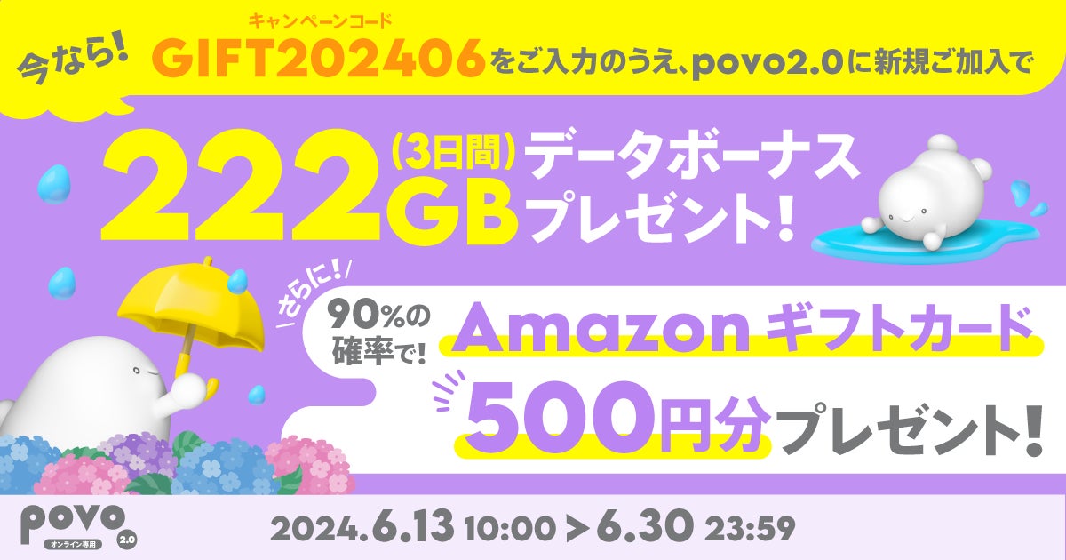KDDI、沖縄セルラーは2024年6月13日から6月30日まで、povo2.0新規加入で、222GB(3日間)が必ずもらえるほか、抽選で90%の確率(注)で「Amazonギフトカード」500円分があたるキャンペーンを開催します。