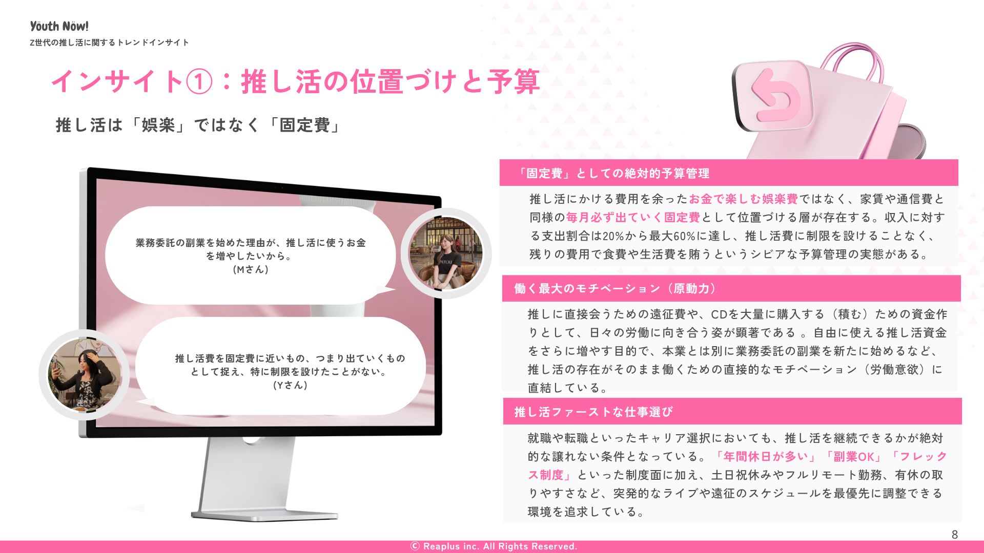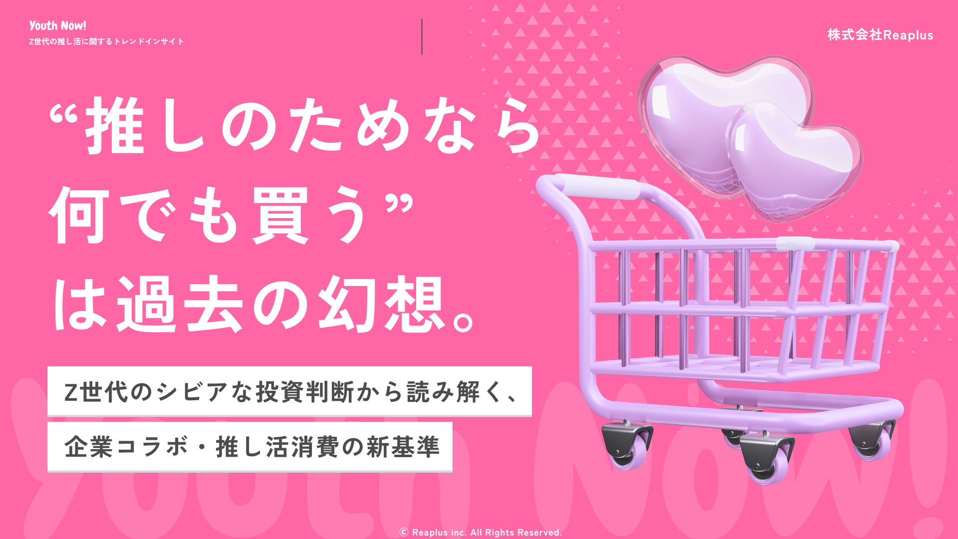株式会社Reaplus[リアプラス](本社:東京都渋谷区、代表取締役:松元 詞音)は、若年層インサイトを可視化するマーケティングサービス「Youth Now!」にて、Z世代を対象に「推し活および企業コラボに関する定性調査」を実施いたしました。