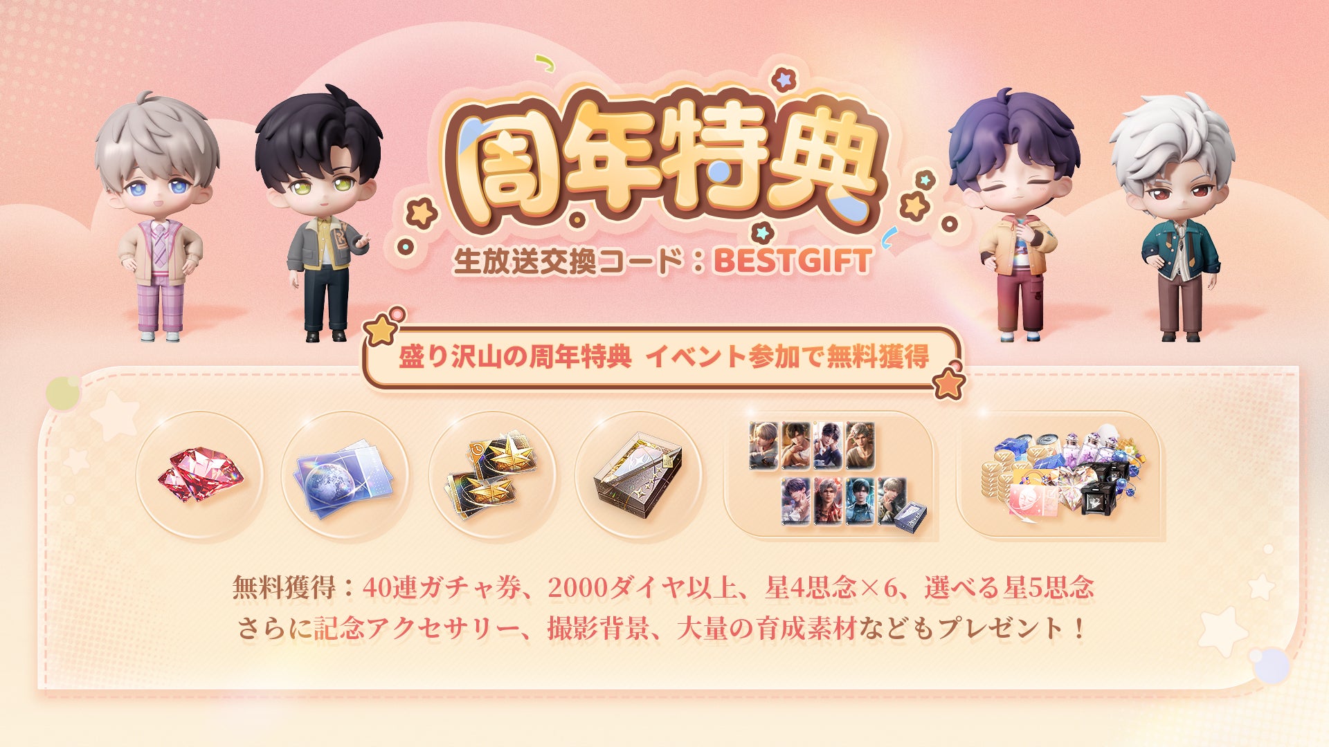 周年を記念した豪華特典が盛りだくさん!イベントに参加すると、以下の報酬を無料で獲得できます。最大40連分のガチャ券、2000ダイヤ以上、星4思念×6、選べる星5思念に加え、記念アクセサリーや撮影背景、大量の育成素材などもプレゼント。この機会をお見逃しなく!