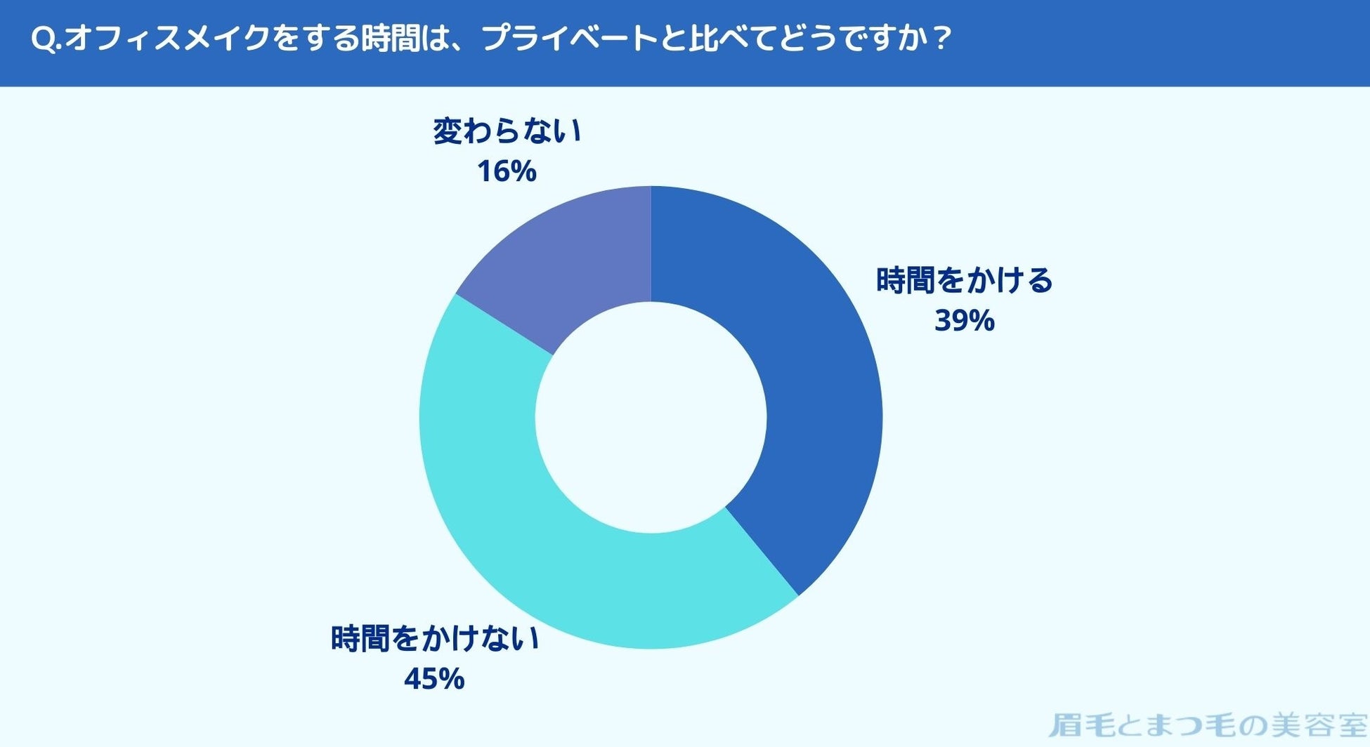 オフィスメイクにかける時間はプライベートと比べてどうかお聞きしたところ「(プライベートより)時間をかける(39%)」、「時間をかけない(45%)」、「変わらない(16%)」という結果になりました。