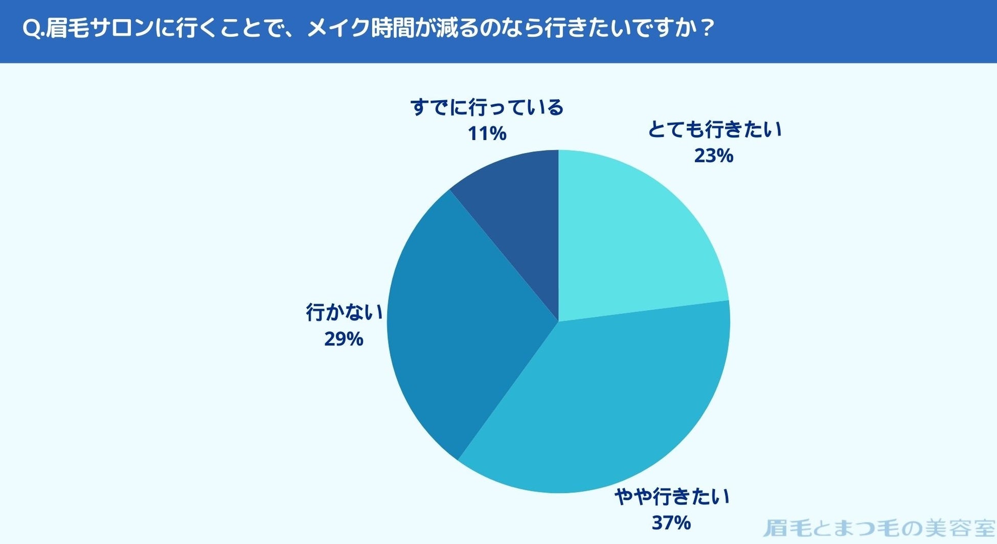 眉毛サロンに行くことで、メイク時間が減るのなら行きたいかお尋ねしたところ「とても行きたい(23%)」、「やや行きたい(37%)」、「行かない(29%)」、「すでに行っている(11%)」という結果になりました。