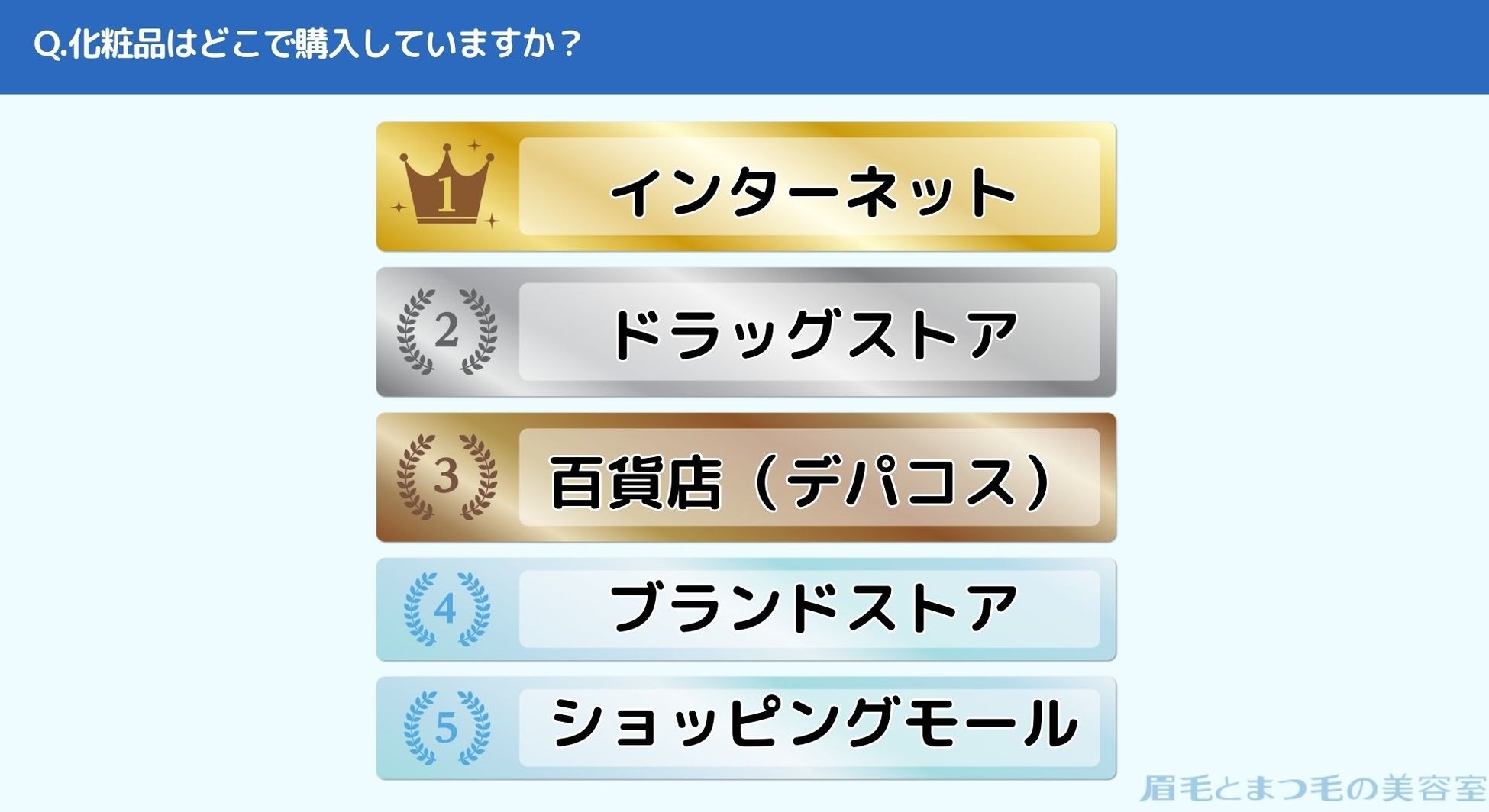 化粧品をどこで購入しているのかお聞きしたところ「1位>インターネット」、「2位>ドラッグストア」、「3位>百貨店」、「4位>ブランドストア」、「5位>ショッピングモール」という結果になりました。