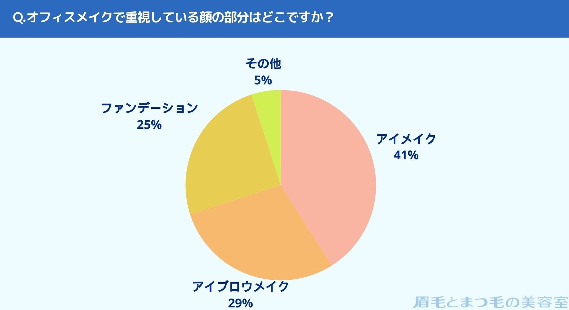 オフィスメイクで重視している顔の部分はどこかお聞きしたところ「アイメイク(41%)」、「アイブロウメイク(29%)」、「ファンデーション(25%)」、「その他(5%)」という結果になりました。