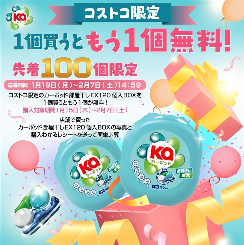 内容:コストコにて対象商品をご購入いただいた方を対象に、購入レシートをカーポッド公式XアカウントへDMでお送りいただくと、先着100名様に「カーポッド 部屋干しEX(120個入り)」をもう1点プレゼントいたします。
