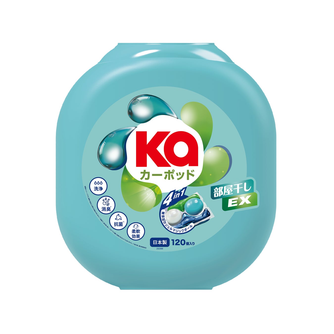 「カーポッド 部屋干しEX」は、部屋干しでもニオイが気になりにくい処方を採用した、ジェルマジックボールタイプの洗濯用洗剤です。1個で「洗浄・抗菌※1・柔軟・消臭」の4役を担い、計量不要でポンと入れるだけの簡単ステップを実現しました。
