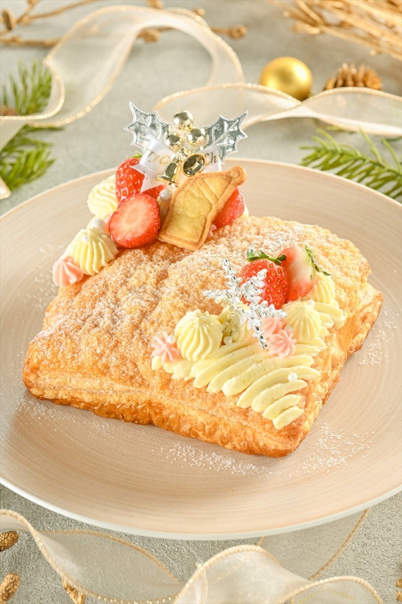 チョコクリームをたっぷり使った濃厚な『Christmasショコラミルフィーユ』は、ナッツ・ドライフルーツ・クリスマスオーナメントで華やかな仕上がりに。いちごクリームを詰めた『Christmasフレーズミルフィーユ』は、パイ生地に生クリームとカスタードクリームを合わせたクリームを贅沢に絞り、フレッシュないちごをあしらいました。甘酸っぱいいちごと軽やかなクリームが相性抜群です。『Christmasミルフィーユ』は、生クリームとカスタードクリームを合わせたクリームが存分に味わえる看板商品「ミルフィーユ」のクリスマスデコレーションです。パイのサクサク食感も魅力の1つ。