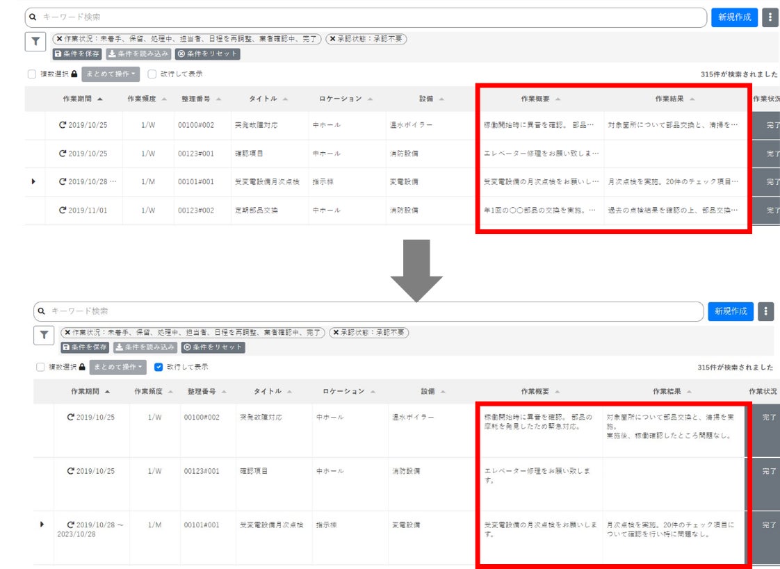 2. 作業計画/履歴の一覧表示で改行表示を選択できる機能を追加