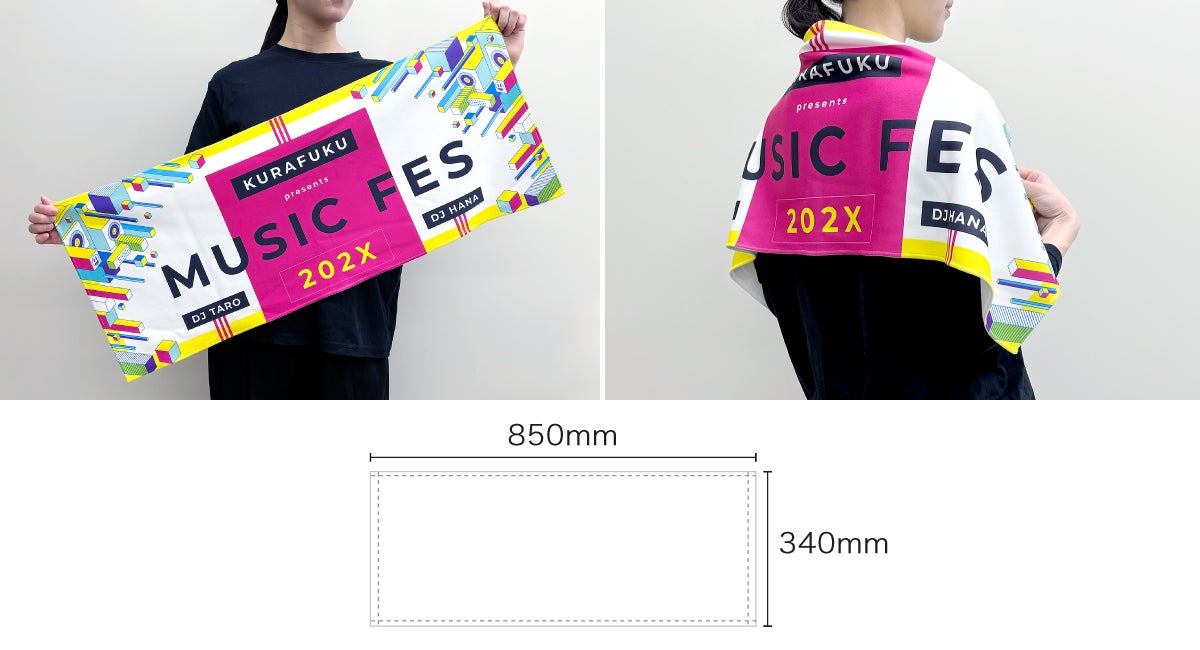 21cm幅の細身のタオルです。肩に掛けたり、首にも巻きやすく、ライブや応援グッズに最適。汗をかいても首元を快適に保ちます。