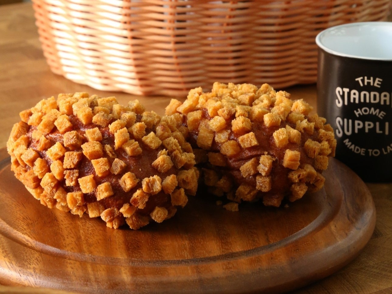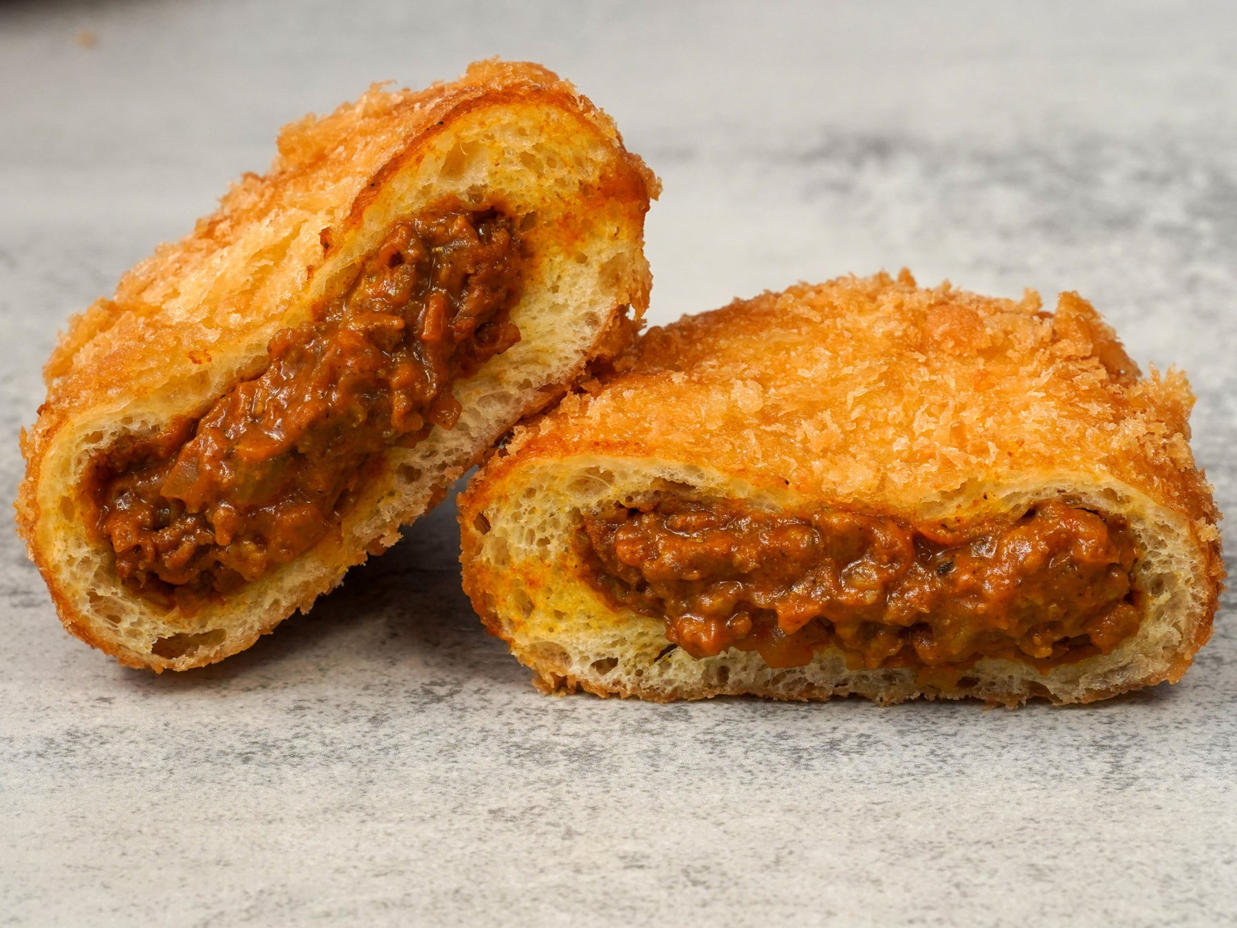 コラボ第2弾商品。鳥羽氏の家庭で親しまれてきた“鳥羽家秘伝のキーマカレー”を、レストラン仕様にアップデートしたこだわりの一品です。カレーにはマンゴーチャツネを加え、スパイシーさの中にほんのり甘さをプラス。誰が食べても美味しく感じられる絶妙なバランスに仕上げました。ひき肉の食感をしっかり残しつつ、カレーパンの生地と調和する特製キーマカレーをぎっしり包み込んでいます。