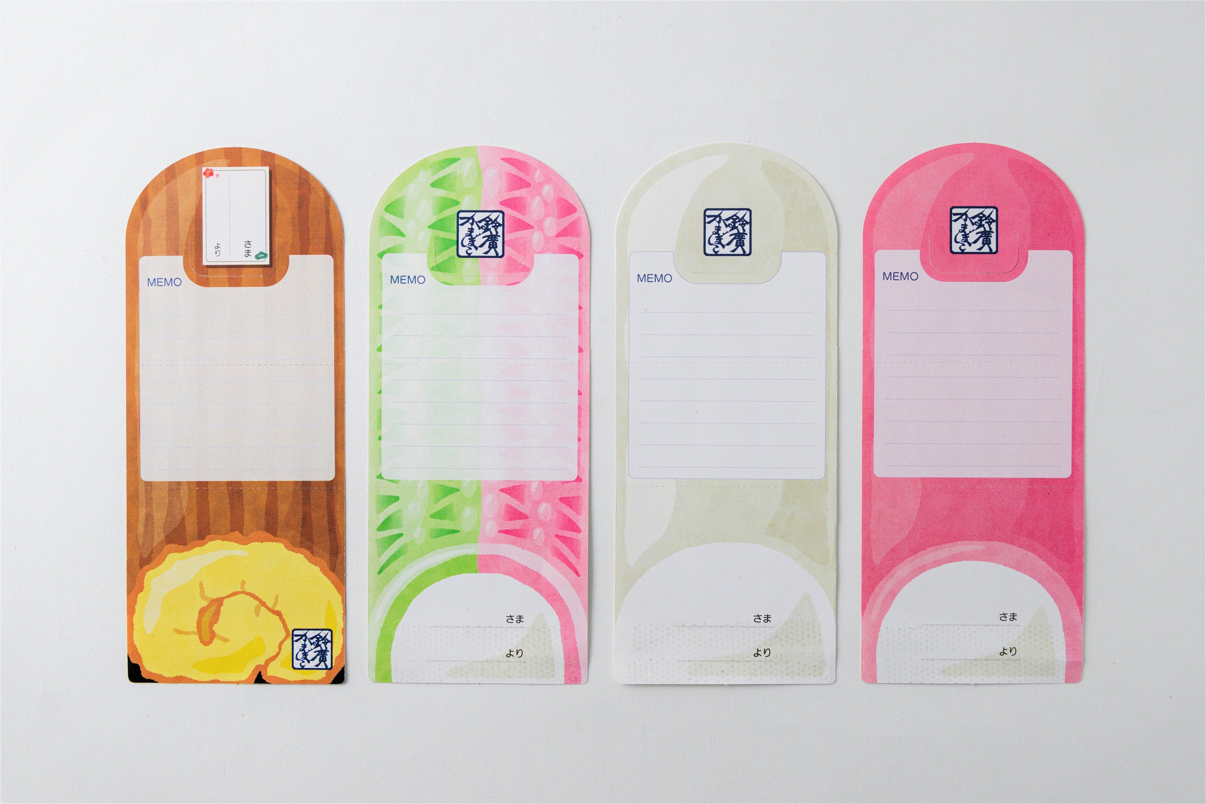 鈴廣の定番商品である「超特選蒲鉾 古今(紅白)・鹿の子」「超特選伊達巻 古黄」をデザインに取り入れ、見て楽しく、使って便利な遊び心あふれるアイテムに仕上げました。お土産に添えるひとことや、ちょっとしたコミュニケーションにも活躍します。
