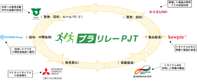 プラスチック容器の地域内循環を目的に、上記6者が2025年2月に包括連携協定を締結し開始した実証実験プロジェクトです。回収した使用済みプラスチックをケミカルリサイクル(油化・モノマー化)し、再び食品用容器に活用する“リレー”モデルの構築をめざしています。