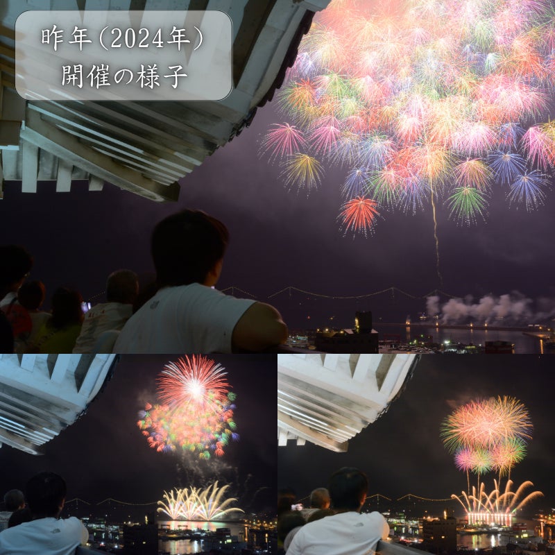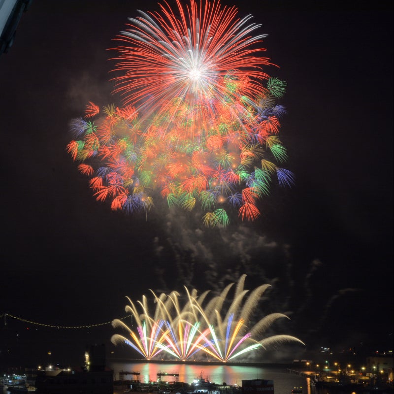 特別観覧席では、今治港から打ち上げられる迫力満点の花火を、瀬戸内海やしまなみ海道といった今治ならではの夜景とともにお楽しみいただけます。今年の「おんまく花火」のテーマは「PASSION」~夏の今治をさらに熱くする10,000発の花火~。テーマに合わせて構成された特別なプログラムで色とりどりの花火が打ちあがり、クライマックスの名物・尺玉100連発では圧巻の大パノラマが展開されます。