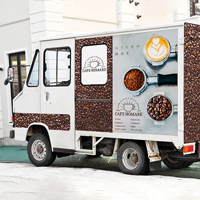 キッチンカー全体の印象を左右するのが、本体そのもののビジュアル。誉PRINTINGでは、キッチンカー車体へのラッピングやロゴ・店舗名の出力・施工の対応もスタート。