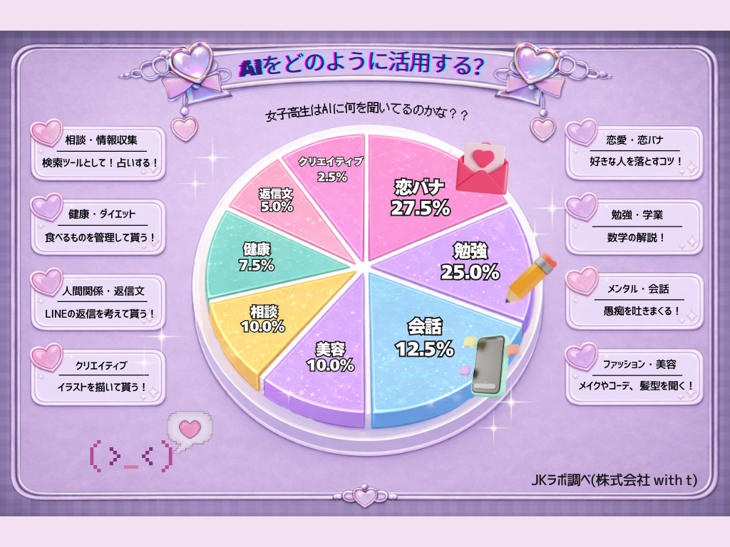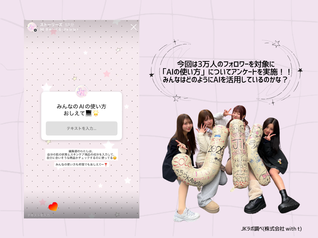ティーン向けエンタテインメント事業を展開する株式会社with t(本社:東京都渋谷区、代表取締役社長:宮城啓太)が運営する、女子高生の「最旬トレンド」を発信・分析するメディア&シンクタンク「女子高生ラボ」は、現役女子高生を対象に「AIの活用法に関する実態調査」を実施しました。