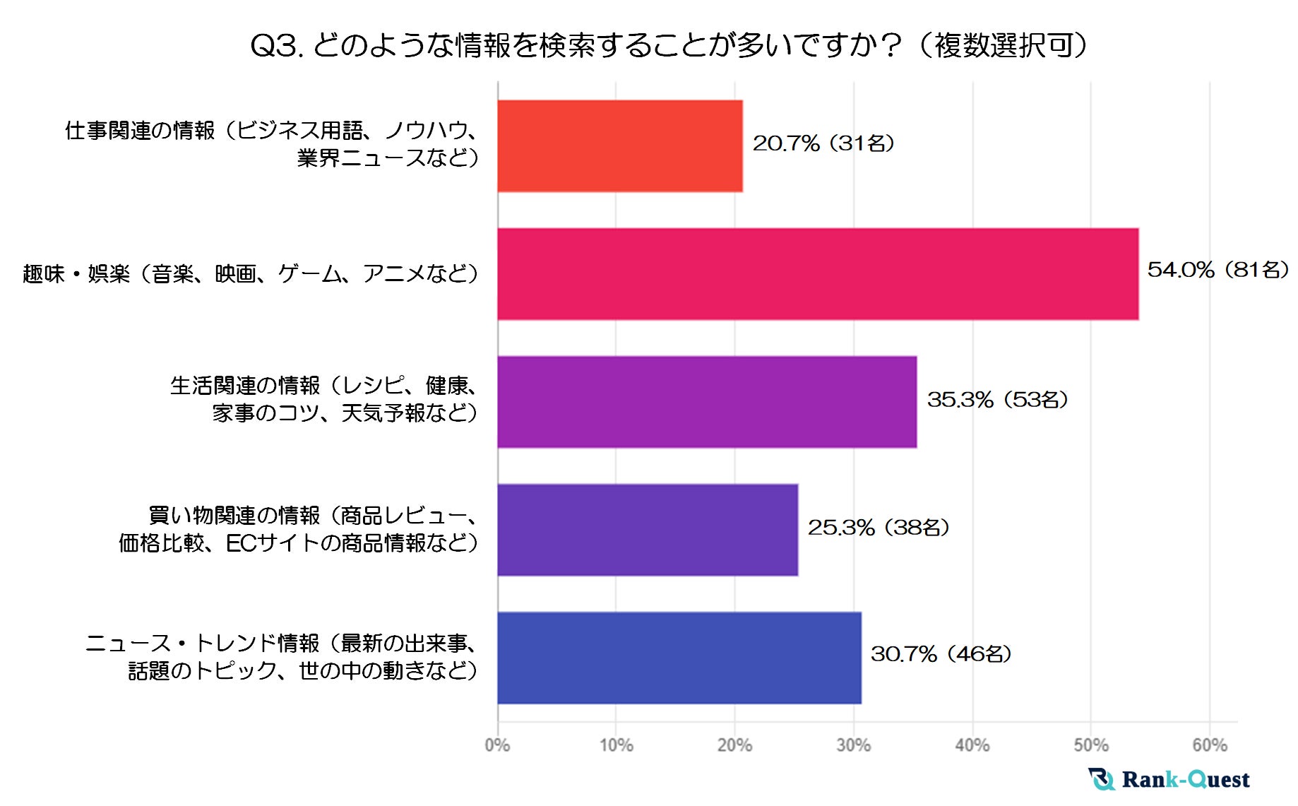 最も多かった回答は「趣味・娯楽」で、54%にのぼりました。30代は仕事や家庭で忙しい日々を送る一方、限られた余暇を充実させるための情報を頻繁に検索していると考えられます。