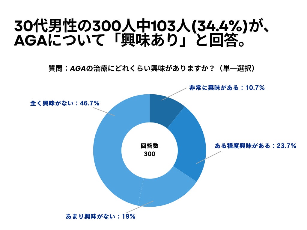 30代男性の300人中103人(34.4%)が、AGA(男性型脱毛症)治療について「興味あり」と回答【AGA(男性型脱毛症)治療に関するアンケート】