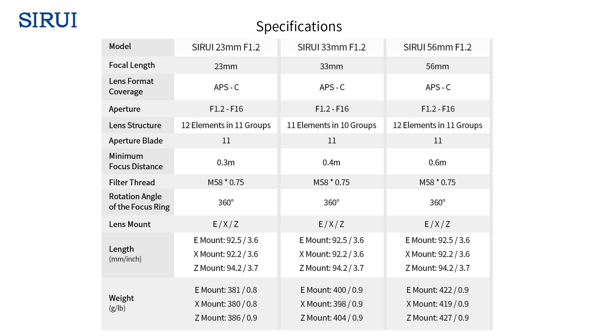 レンズフードの色もレンズ本体と統一されており、レンズ本体には細いブルーの金属リングが施されています。このブルーはSIRUIロゴのカラーに合わせており、SIRUIならではの特徴です。
