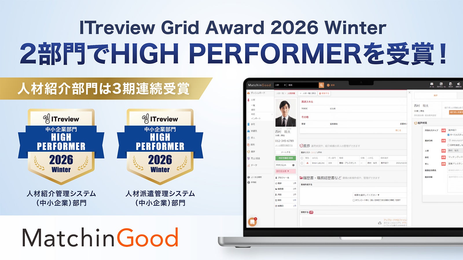 人材紹介は3期連続! MatchinGoodが「ITreview Grid Award 2026 Winter」の人材派遣・紹介管理両部門で「High Performer」を獲得