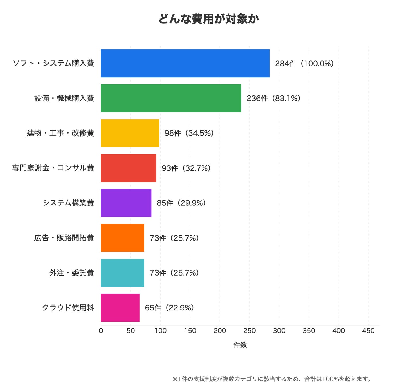 ソフト・システム購入費を対象とする制度の8割超が、設備・機械購入費も同時に対象にしています。