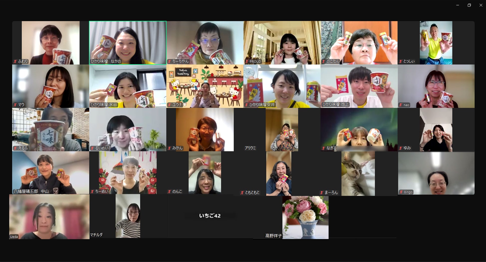 オンラインランチ会では、事前に送付した『七味みそ汁 八幡屋礒五郎 カップ』に参加者全員で同時にお湯を注ぎ、好みの量の「七味唐からし」を振りかけて試食し、お互いの感想を交えながら楽しいひと時を過ごしました。また、当社社員からは本商品のこだわりや誕生秘話を、八幡屋礒五郎の社員からは七味の歴史や特徴などについて説明し、イベント後半では事前に送付した八幡屋礒五郎オリジナルの各種「七味唐からし」をテイスティングして、種類を当てるゲームにも挑戦していただきました。参加者からは「赤を基調にしたパッケージで七味がイメージしやすく素敵なデザイン。」、「七味の辛味が、まろやかな甘めの味噌に合ってすごくおいしい。」といった感想をいただき、大盛況にて終了いたしました。