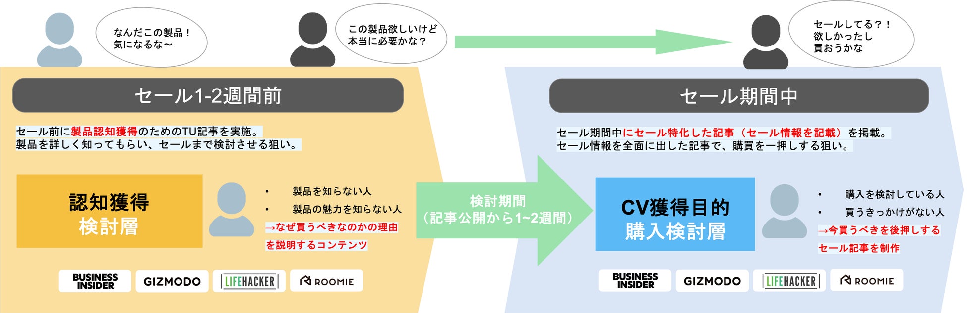 大型セールなどのタイミングに合わせて、コンテンツ(記事/動画)を制作。セール開始より前に商品理解と購入関心度を高めることで、セールタイミングでの購入のあと押しを強化していきます。