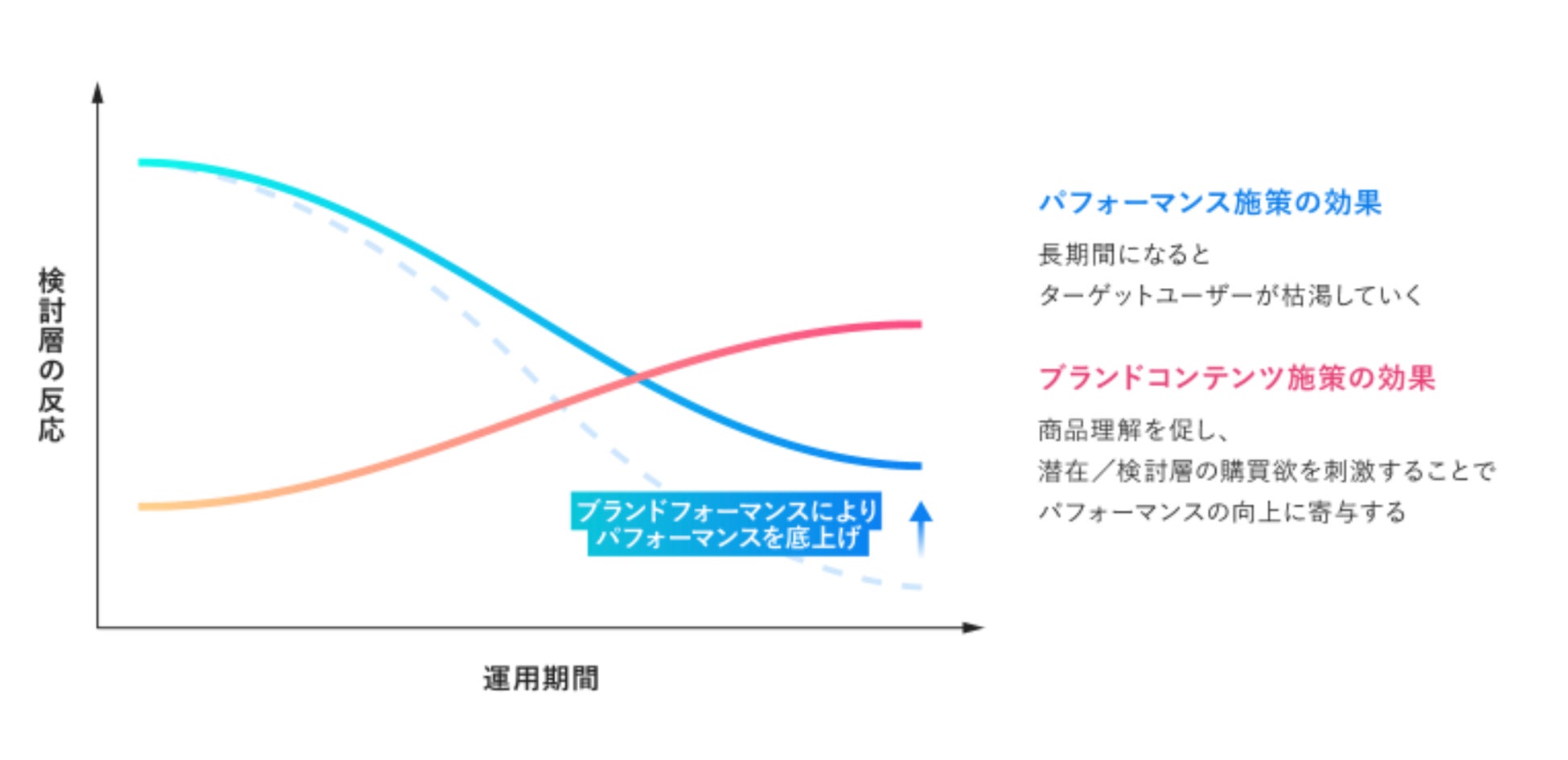 パフォーマンス施策の効果を最大化するため、ブランドコンテンツ施策を同時に展開し、検討ユーザーの増加だけでなく、購買意欲を高める役割を担います。このアプローチにより、パフォーマンス施策全体の成果を底上げし、施策の効率向上を目指します。