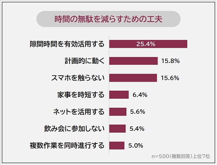 「時間の無駄を減らすための工夫」を聞いたところ、1位は「隙間時間を有効活用する(25.4%)」でした。2位「計画的に動く(15.8%)」、3位「スマホを触らない(15.6%)」が続きます。