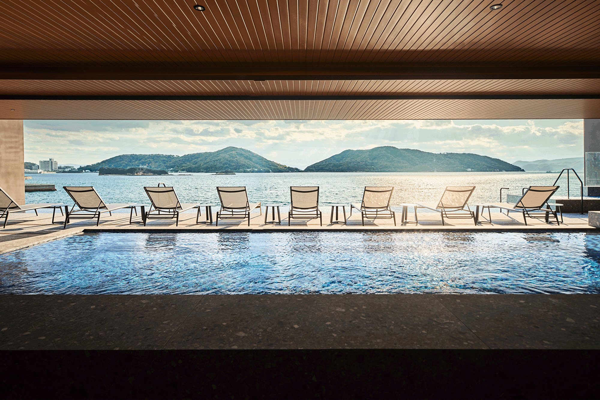 水温15度、深さ1.2mの水風呂や、外気浴スペース、美しい瀬戸内の海と島々と一体になるようなインフィニティープール、多様な温度で身体を温める屋内風呂やジャグジーなどその全てがオーシャンビューで一年中ご利用いただけます。