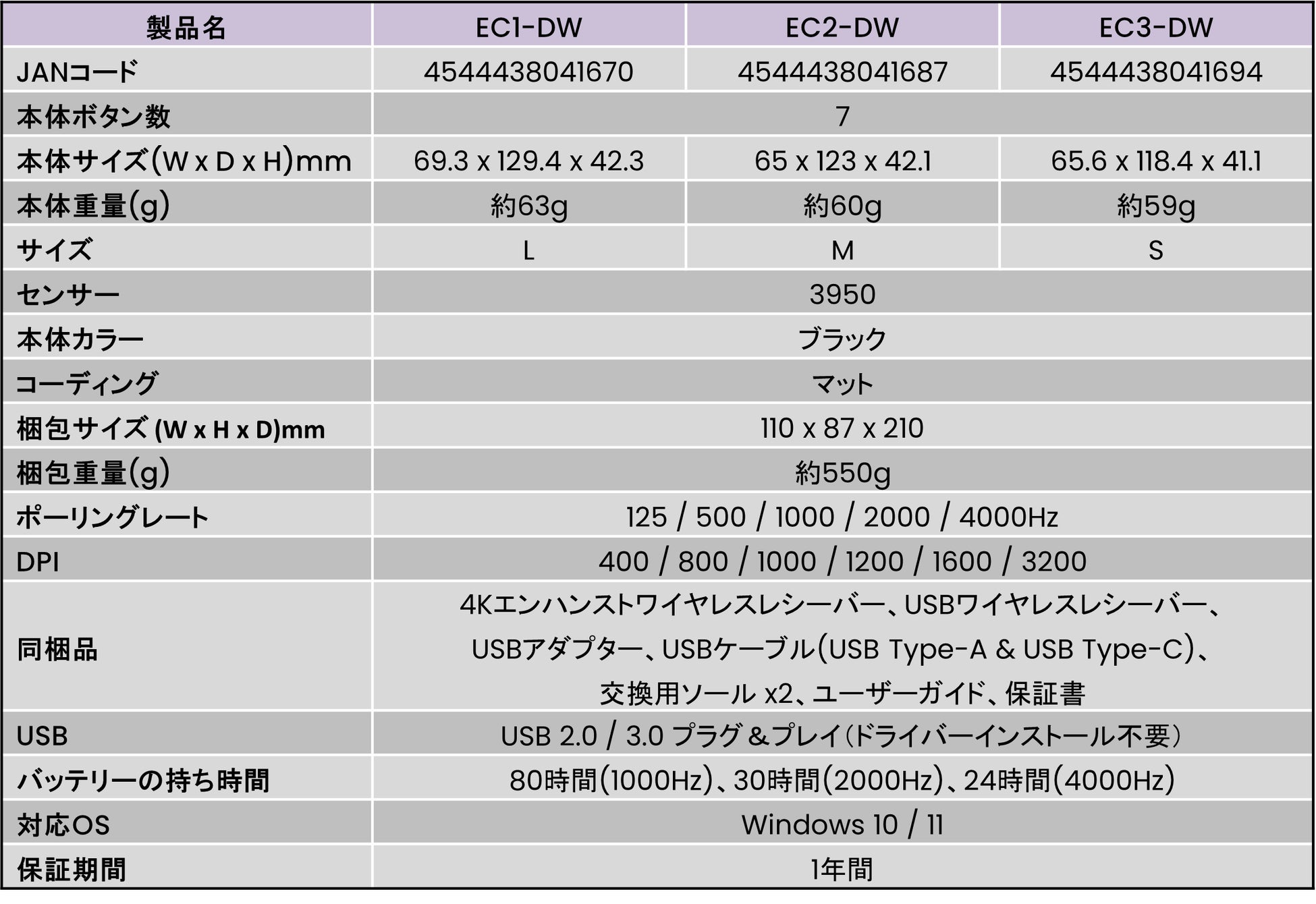 「EC1-DW」「EC2-DW」「EC3-DW」製品仕様表