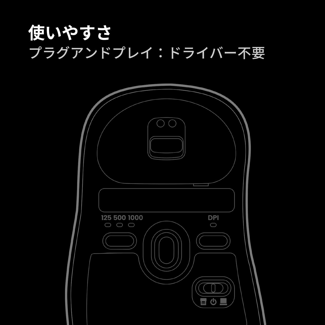USBポートに繋ぐだけで、すぐに使用可能で、手間のかかるドライバーインストールは不要です。USBのポーリングレートは125、500、1000、2000、4000Hzから、DPIは400、800、1000、1200、1600、3200から設定が可能で、プレイスタイルや好みに応じて調整できる柔軟性の高さが特長です。