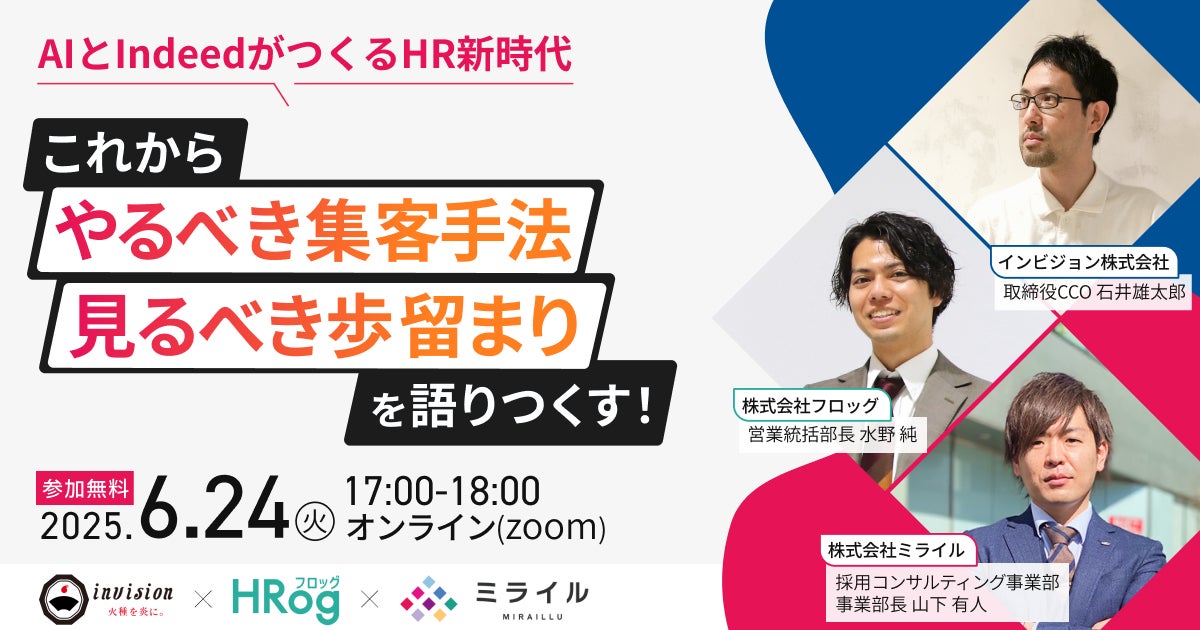 分析用求人ビッグデータを提供する株式会社フロッグ(所在地:東京都千代田区、代表取締役:阪野 香子、以下「当社」)は、2025年6月24日(火)にオンラインセミナー「AIとIndeedがつくるHR新時代!これからやるべき集客手法、見るべき歩留まりを語りつくす」を開催いたします。