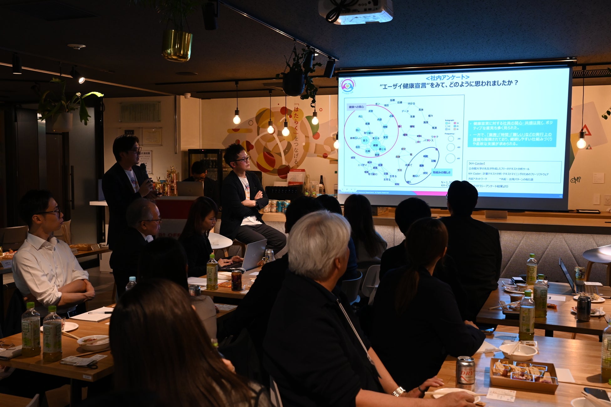 エーザイ大澤氏・三瓶氏より、同社のコーポレートミッションと連動した健康経営の先進的な取り組みや、その背景にある戦略についてご紹介いただきました。成功事例だけでなく、苦労や苦い体験談など、クローズドの場ならではのお話をしていただきました。