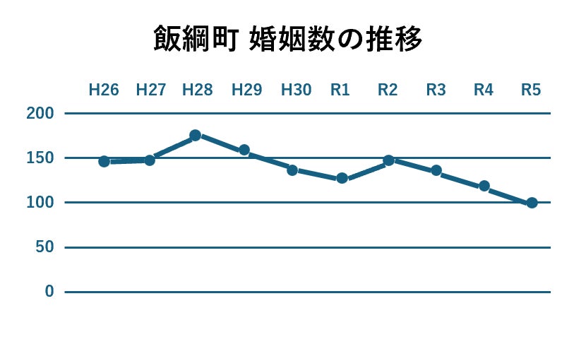 飯綱町では、移住者向け助成や子育て支援等の充実により、2024年に町発足以来初めての社会増(転入超過)となりました(※図①)。助成事業の拡充や飯綱町の魅力を発信し続けることで、社会増が実現した一方、飯綱町の婚姻数は年々減少傾向にあります(※図②)。