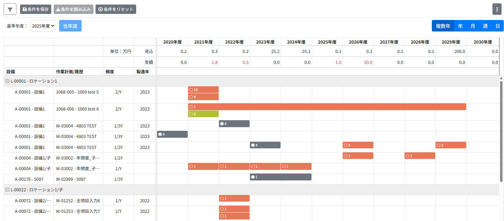 MENTENA上で管理されている日常の点検・保全・修繕データを起点に、定期修理(定修)や法定点検、自主点検を含む作業計画/履歴のスケジュールを10年分表示・俯瞰できます。年単位での計画策定や予実管理を前提としており、設備数が多い事業所でも、中長期の作業計画の全体像を直感的に把握でき、人員リソースやコストの平準化を図ることが可能です。
