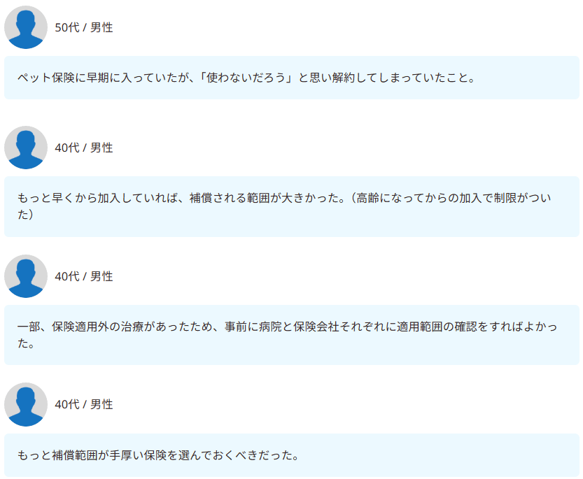 解約してしまったことや、補償範囲の理解不足など、ペット保険に関する後悔の声が目立ちました。