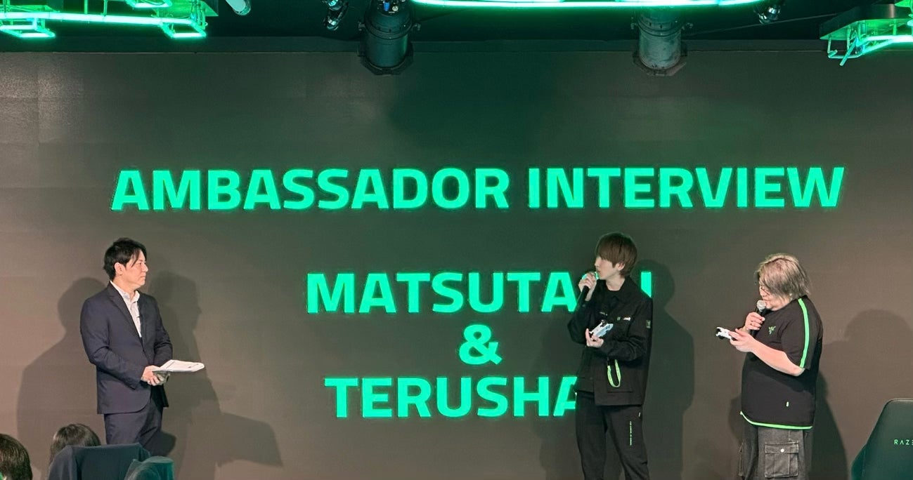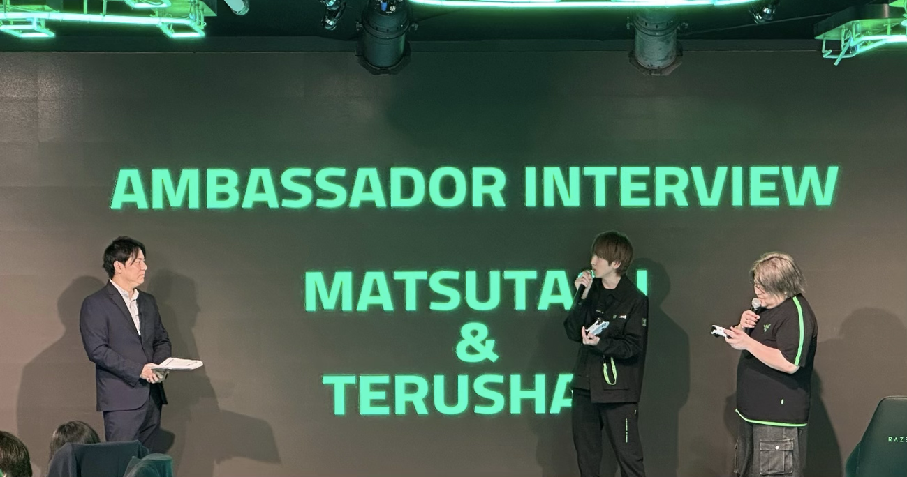 次にRazerのアンバサダーでもあるプロプレイヤーのMatsuTasu選手と、プロゲーミングチーム父ノ背中のリーダー、てるしゃんさんが登壇。すでに、今回紹介したRaiju V3 ProとBlackShark V3 Proを使用しており、その使用感について熱く語っていました。