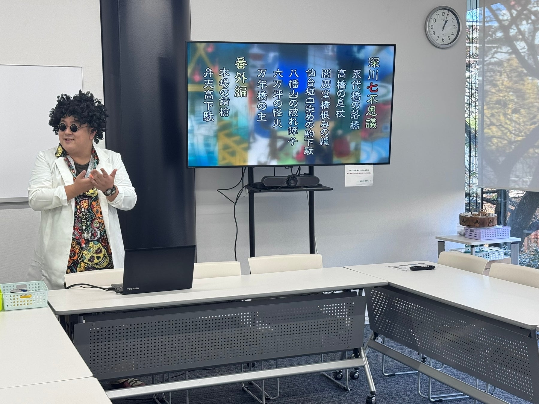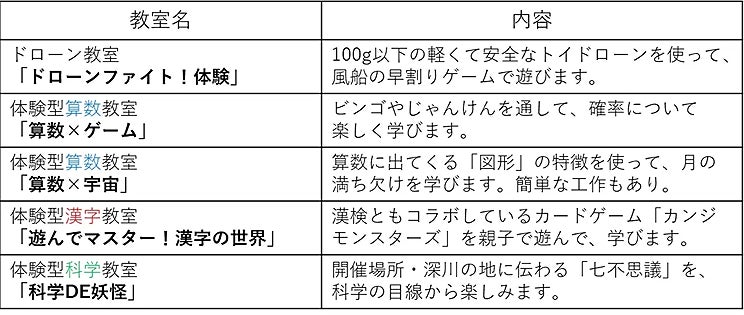前回の8月に続いて、ドローン・算数・漢字・妖怪をテーマにした5種類の教室を展開し、多様な学びと体験の場を提供しました。今回は新たに、民俗学と科学をミックスさせた「科学DE妖怪」を開講し、妖怪やお化けが好きな子どもたちに向けて、その興味から自然に科学へつながっていけるよう工夫しました。延べ13組/31名の親子にご参加いただき、活発なコミュニケーションを取ることができました。