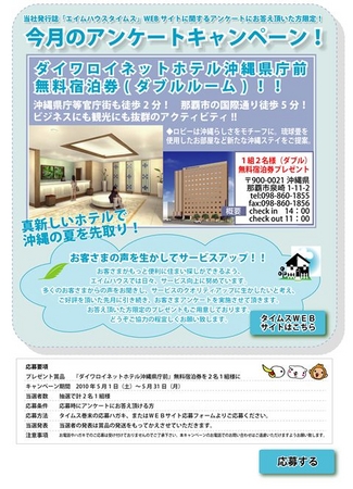 なお、今月はアンケートにお答えいただいた方の中から、抽選で1組2名様に「ダイワロイネットホテル沖縄県庁前」の無料宿泊券をプレゼントします。