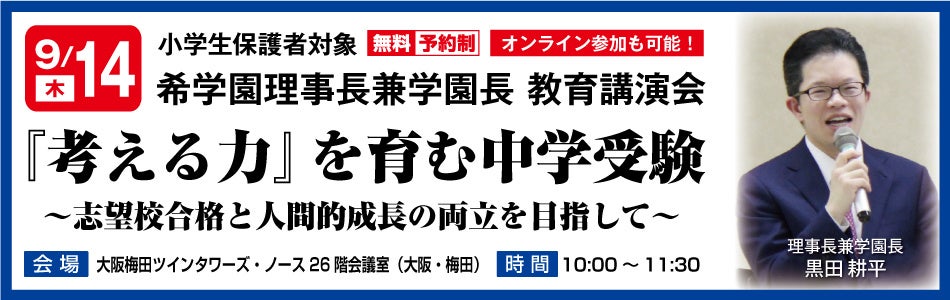 ついては、子どもたちが未来を生き抜くために必要な「考える力」を身につけることのできる中学受験とするにはどのようなことに留意すればよいのか、子どもたちを支える保護者の皆さまのあるべき姿も交えながら、希学園 理事長 兼 学園長 黒田耕平が、多くのお子さまの中学受験を共に歩ませていただいた経験を踏まえて講演いたします。
