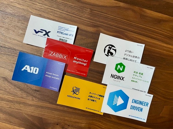 名刺サイズのカードと六角形の統一規格ステッカーに各社が独自デザインを施し、展示会やコミュニティイベントで配布されます。カード・ステッカーには、その企業のロゴに限らず、提供しているプロダクトやサービス、様々なメッセージなどが添えられ、イベントだけで配布される特別デザインなども登場します。