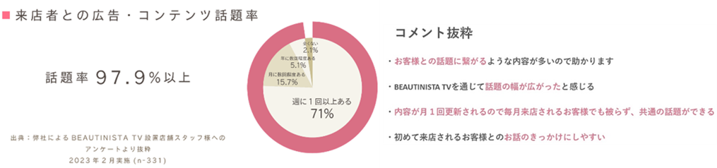 美容師様とお客様の間でBEAUTINISTA TVに関する話題率は97.9%となり、そのうち71%が週に1回以上と回答。BEAUTINISTA TVはお客様だけではなく美容師様も一緒に見ることができるメディアだからこそ、美容師様とお客様の会話のネタにもなりやすいことが見受けられました。