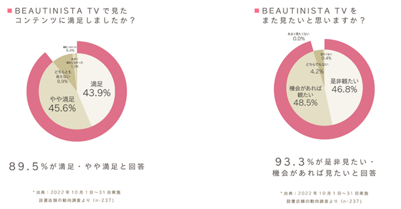 BEAUTINISTA TV設置店舗へ来店したお客様に実施した調査では、89.5%のお客様が「満足している」と回答。また93.3%が「また見たい」と回答しており、来店されるお客様にもBEAUTINISTA TVが受け入れられていることがわかりました。