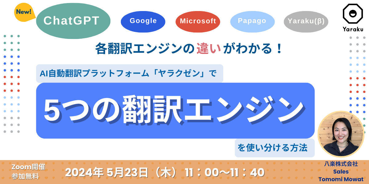 八楽株式会社は、AI自動翻訳プラットフォーム「ヤラクゼン」にChatGPTを翻訳エンジンとして搭載したことを記念し、特別セミナーを開催いたします。ヤラクゼンはグローバルコミュニケーションを円滑にする自動翻訳ツールであり、ChatGPTを翻訳エンジンとした搭載することにより、これまで以上に高品質な翻訳が可能となりました。八楽は今後も様々な分野のグローバルコミュニケーションの課題を解決し、社会や企業のグローバル化に貢献できるよう尽力して参ります。