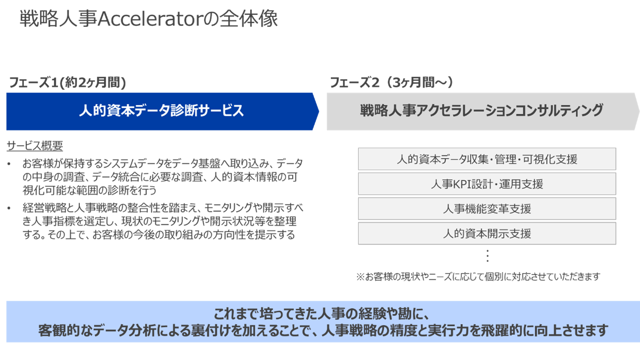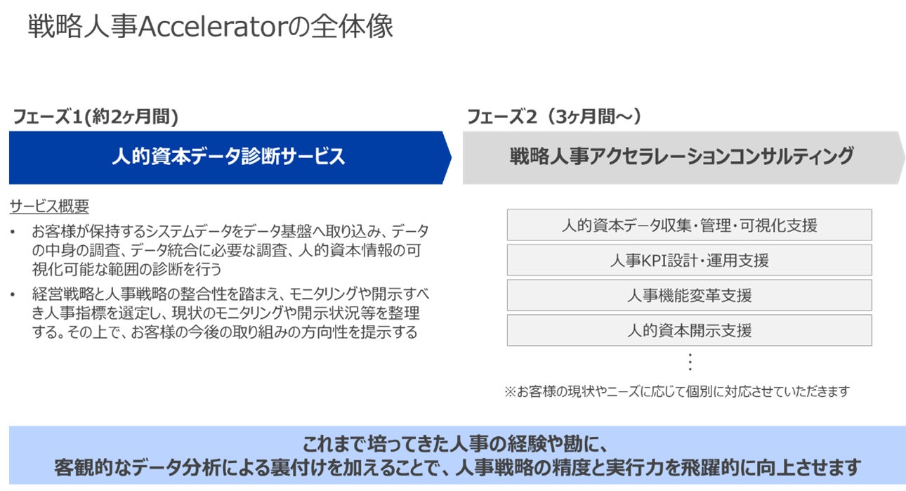 「戦略人事Accelerator」は、企業の人事部門がデータドリブンHRおよびピープルアナリティクスを本格的に推進し、戦略人事へ迅速かつ効果的に移行するためのコンサルティングサービスです。