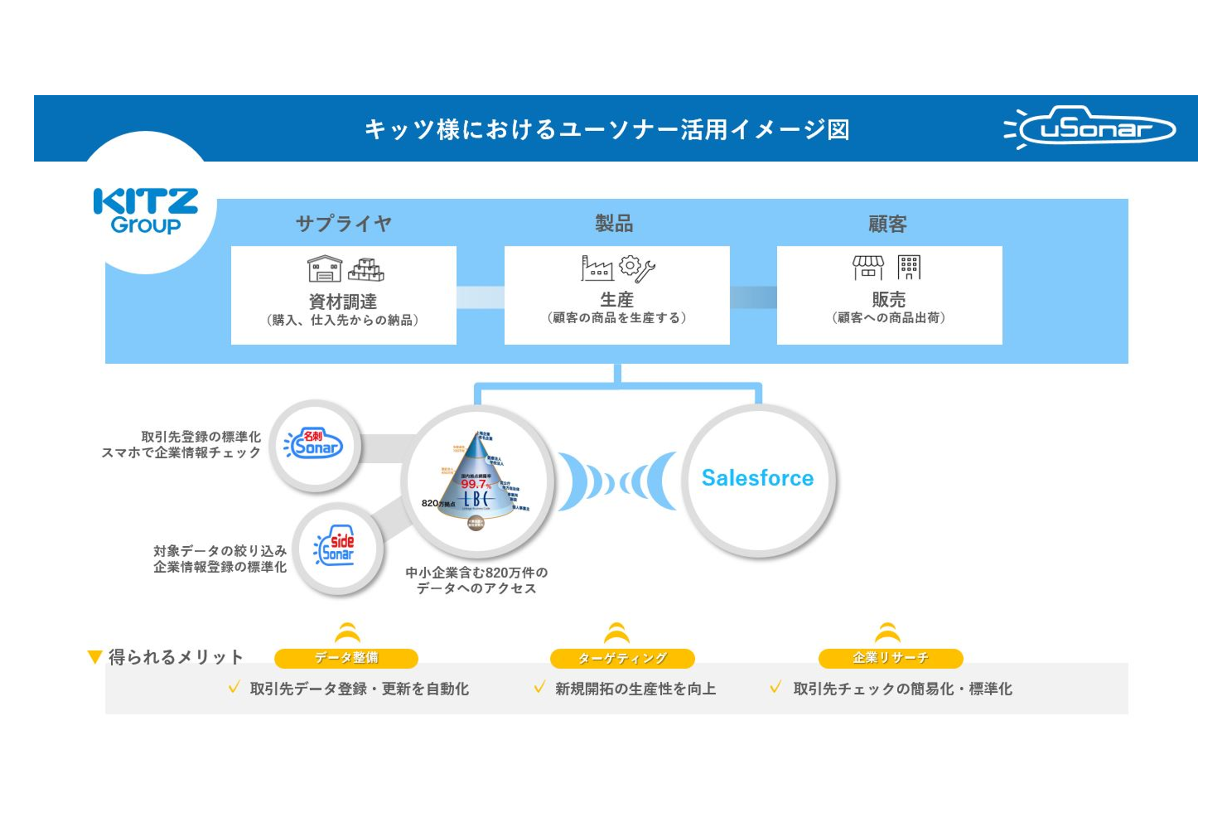 製造業においてDXを進める各企業は、SalesforceをはじめとするSFA/CRMの導入により、商談情報など顧客に関する情報を徹底的に蓄積・分析し営業新規開拓力や受注率の向上を目指しています。一方でSalesforceの導入に伴う新たな業務として、情報の蓄積や更新が必要となり、営業側の入力工数が増えることが課題となります。つまり「情報の蓄積や更新はできるだけ自動化・効率化し、現場の負担は減らしたい」という要件が発生します。そこで活躍できるのが顧客データ統合ソリューション「ユーソナー」です。